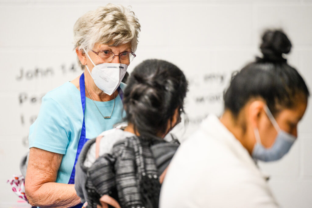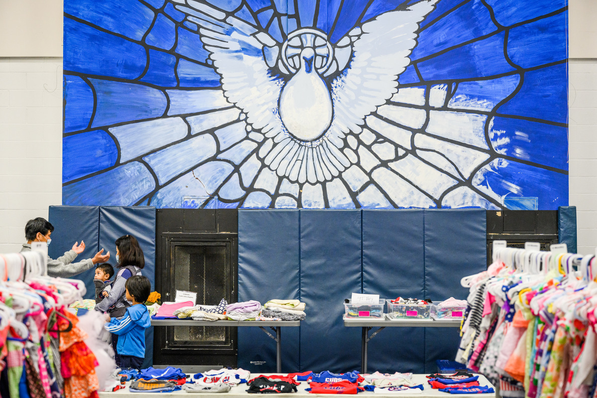 Inside the church’s gymnasium, tables and racks displayed available children’s clothing, while an area of strollers and toys under a large cross attracted children to one end of the room. Guests waited at the door to register near a sign that read: “God loves you! And so do we!”