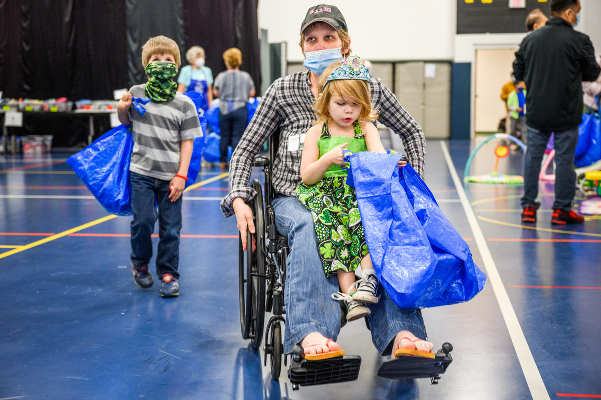 Lauren Thomas, a wheelchair-bound mother of two with one more on the way, let daughter Viola ride on her lap with a bag of clothing while son Gideon walked behind, carrying another bag of items. Thomas, who has visited several times, said she’s thankful for the help from the church.