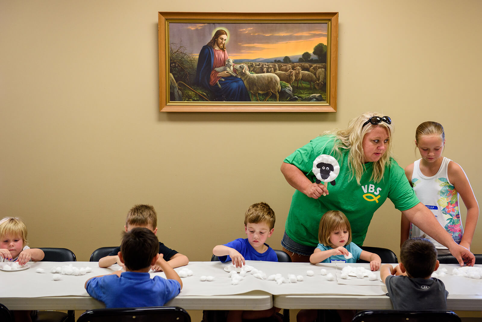 Top: Campers make sheep crafts during Camp Courage at Zion Lutheran Church, Ottawa, Ill. Middle: A volunteer and camper share a fun moment. Bottom: The Rev. David Daniel, pastor of Zion, high-fives campers at the end of the day.