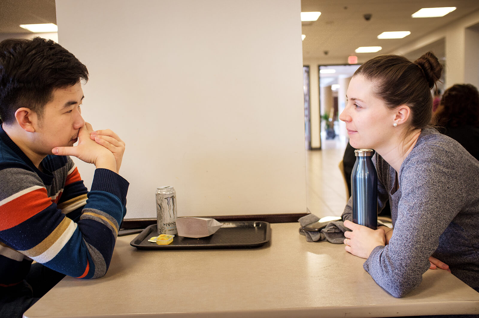 Rebecca Wagner talks with Juncheng, a Chinese student studying philosophy, over lunch at the university.