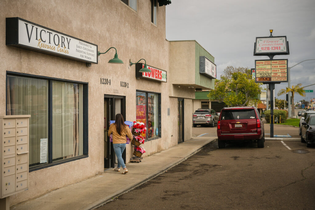 Containers of baby formula are stacked on shelves behind the front desk. Grab bags of diapers line one wall, ready to be handed out. In a storage room, gently used children’s clothes have been neatly sorted by size and gender into plastic tubs. At the back of the building, an industrial refrigerator holds food from the San Diego Food Bank, and bags of fresh fruit, donated from a local public high school’s cafeteria, are stored on a table nearby.