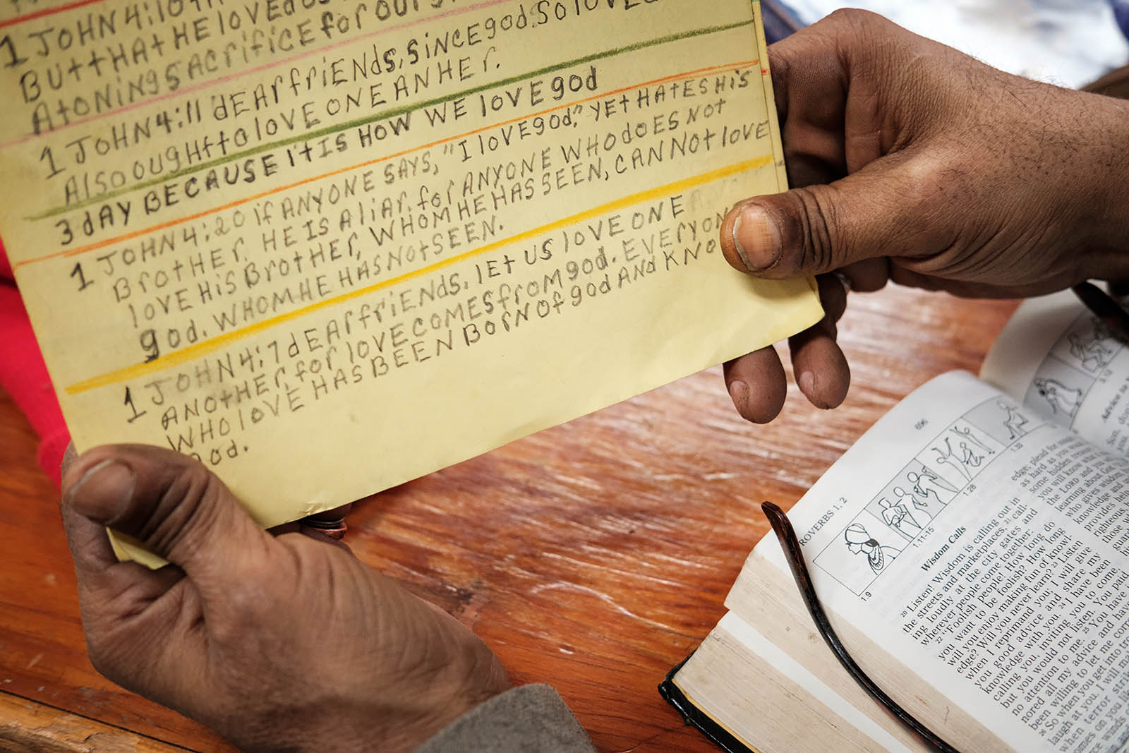 On the day of the dedication service, one man sat and copied the Bible by hand. It’s something William Holloman does regularly — sometimes copying his favorite verses, sometimes entire books. “When I write the Bible, it’s Christ Jesus and the Holy Spirit,” said Holloman. When asked what Family of God means to him, he smiled and said, “Pastor Jim is my teacher.”