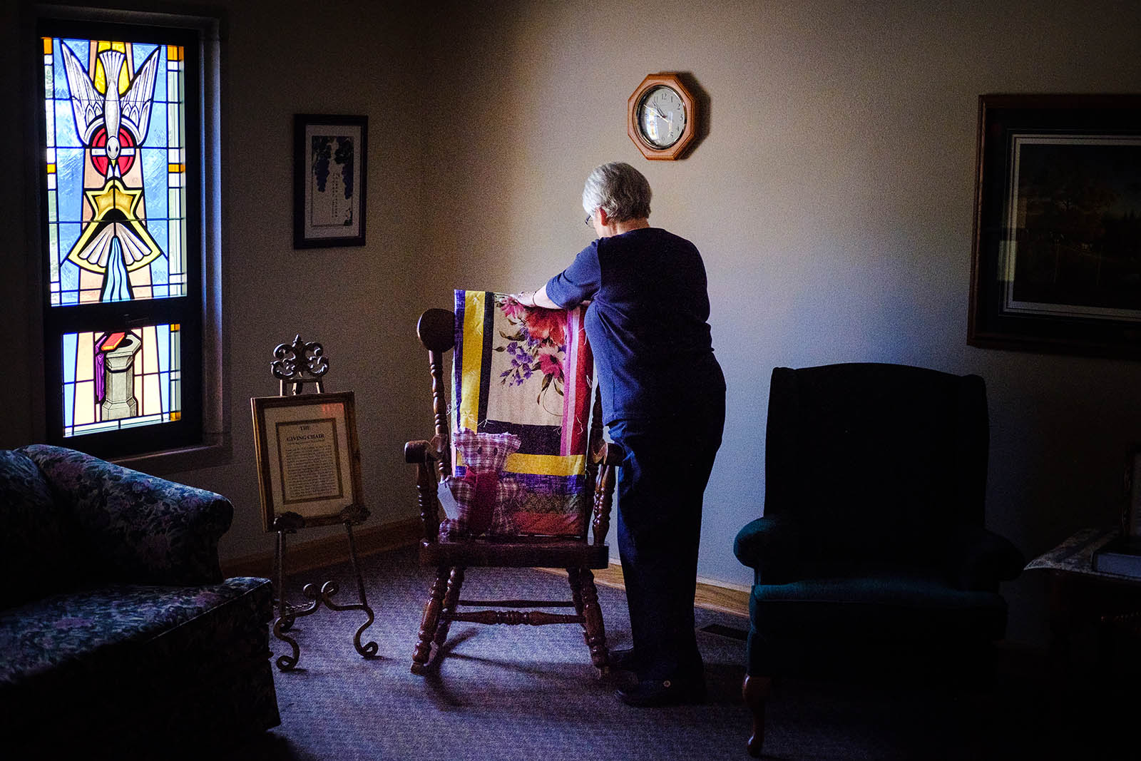 TLC Quilters organizer Barb Bitterman pauses and prays at the Giving Chair, a rocking chair adorned with a quilt made by the TLC Quilters. The quilt on the chair can be taken by any member of the church family and given to someone that they feel is in need.