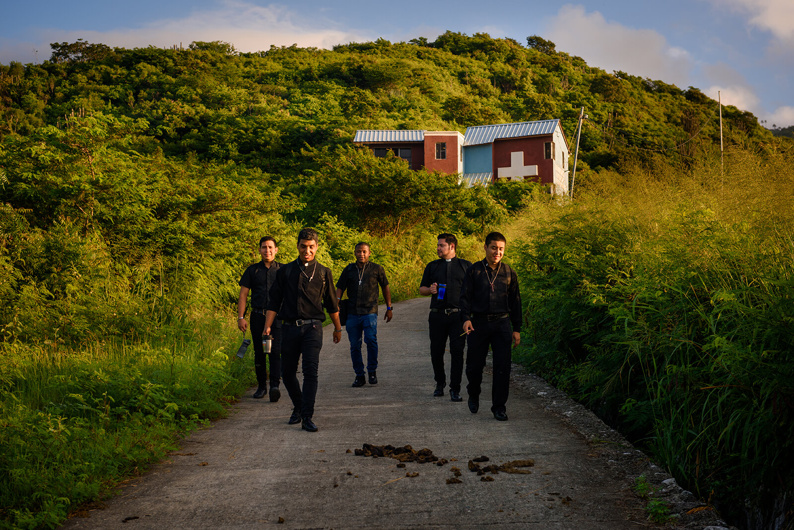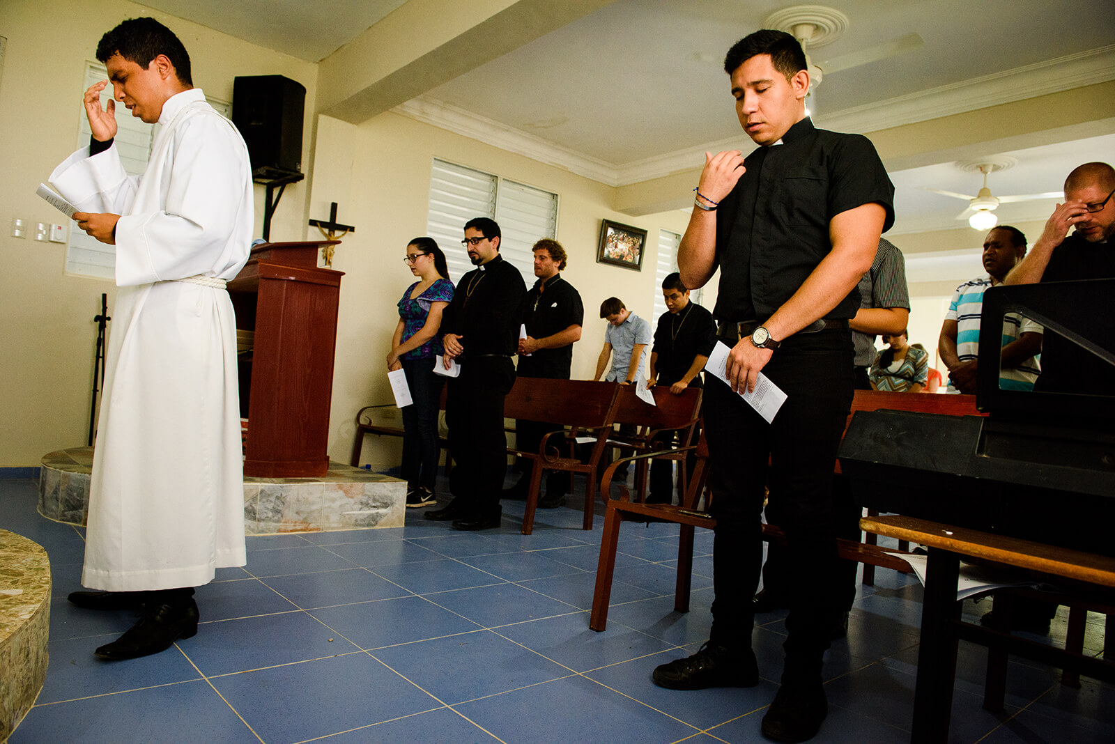Marcelo Rivas (center) and his fellow seminarians chat after class in October in the Dominican Republic.