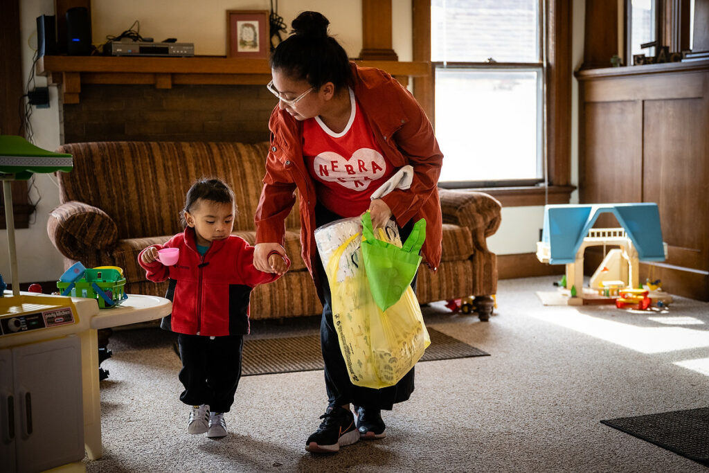 “It’s been a very big blessing not only for myself and my kids but also for my family and faith,” said mother Jennifer Luna. She collected her diapers while her son, Jeremiah, played in the toy kitchen of the home’s living room area.