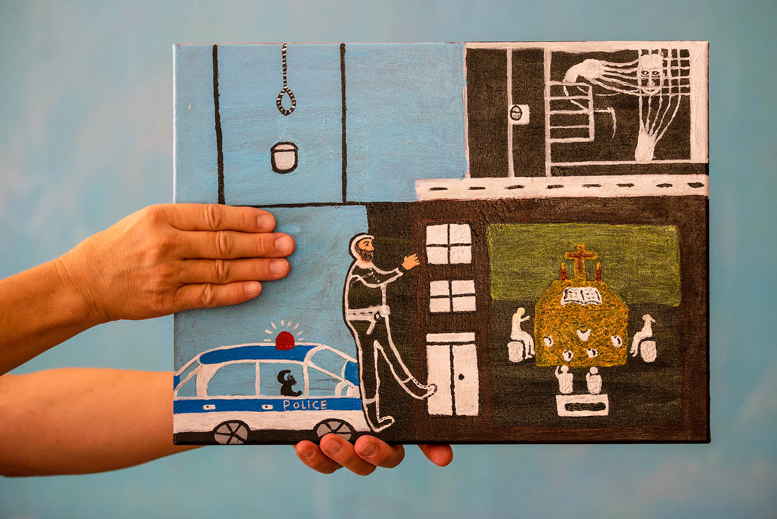 The young lady loves Jesus and rejoices that He loves her. She paints to express her faith and to process her pain. One painting contains frightening images: a police officer spying on a house church, a prison cell and hangman’s noose.