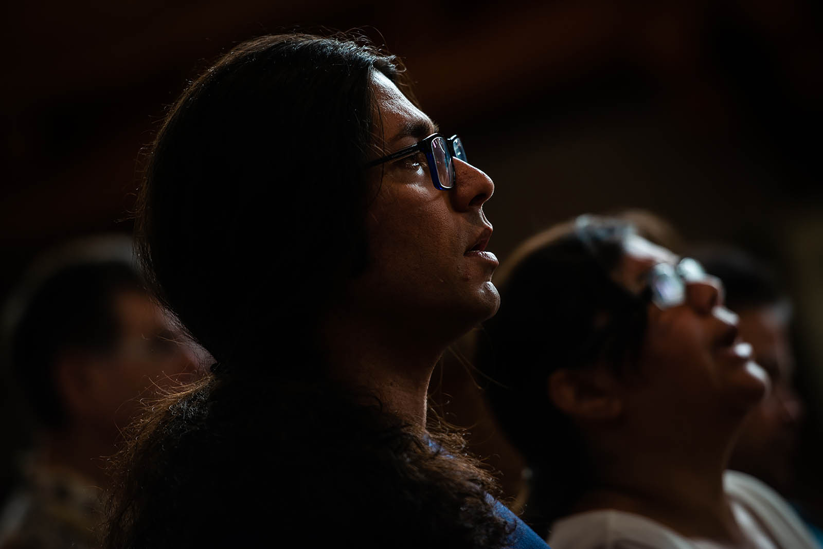 Iranian refugees Ahoura and Atefeh sing during worship in Leipzig.