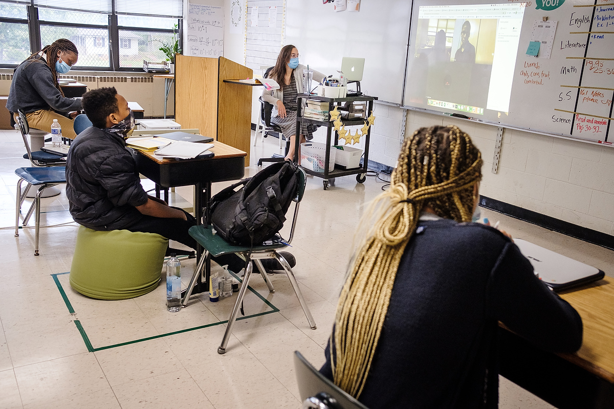 “It’s been pretty challenging. It definitely takes a lot of extra time, a lot of extra planning,” fourth-grade teacher Daneen Hanson said of prepping for both sets of students while also navigating the inevitable technology issues that have arisen.