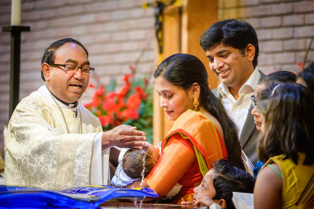 The Rev. Sagar Pilli baptizes a child in February.