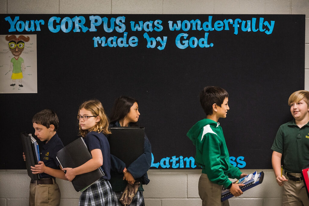 Students queue in the hallway before class.