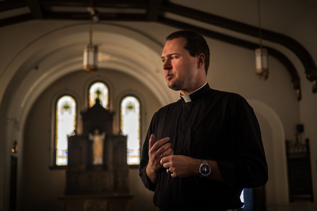 Inside St. John’s sanctuary, a tarp covers the railings in front of the altar. Although the ceiling beneath the damaged roof still holds, streaks from the rain are visible down the walls. Cracks are forming. Above the altar, a statue of Jesus stands with arms outstretched.