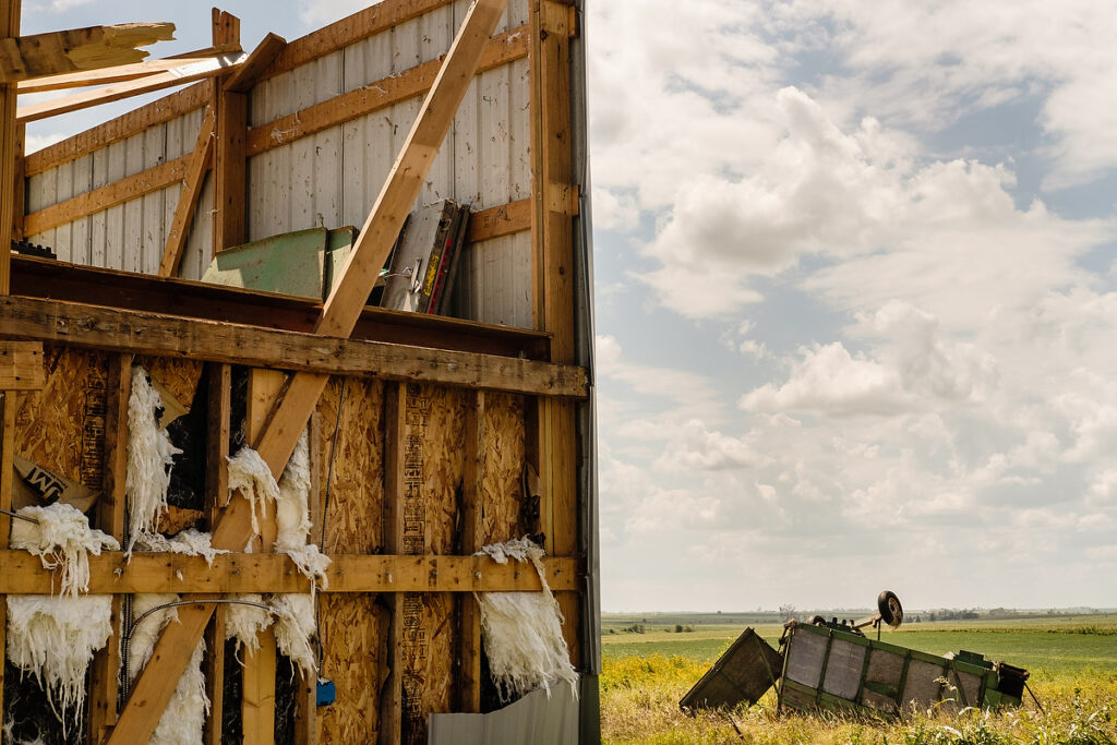 “Those trailers were over there when the storm started,” Franzenburg says, gesturing toward a place 20 feet out in a bean field. Now they sit against the edge of the field, one on its side, the other’s wheels facing the sky. An old corn crib lies crumbled, its roof resting atop a heap of timber, broken crates and spilled beans.