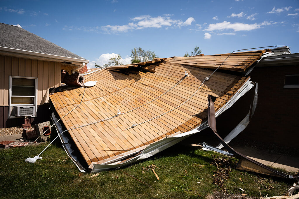 Sixteen miles down the road in Newhall, Iowa, Frank Parris, principal of Central Lutheran School, is standing next to what used to be the roof of one of the school’s gyms. Now part of that roof lies upside down in a courtyard outside. The other half crashed through the wall of a neighbor’s house.