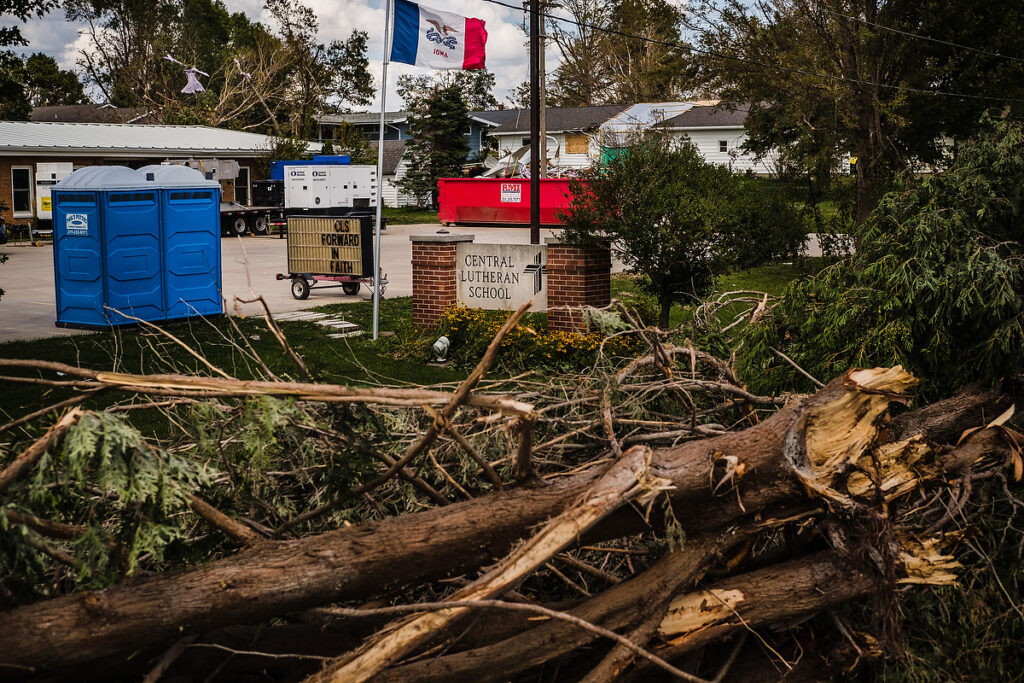 Cedar Rapids, the second-largest city in Iowa, is inside the region of Iowa that saw the fastest and most damaging winds during the storm. A week later, trees are down everywhere. Some still rest on houses, where they fell. Homes, businesses and properties in every direction are missing shingles, siding, parts of their roofs. In many places, brand-new power poles already stand where the old ones were splintered.
