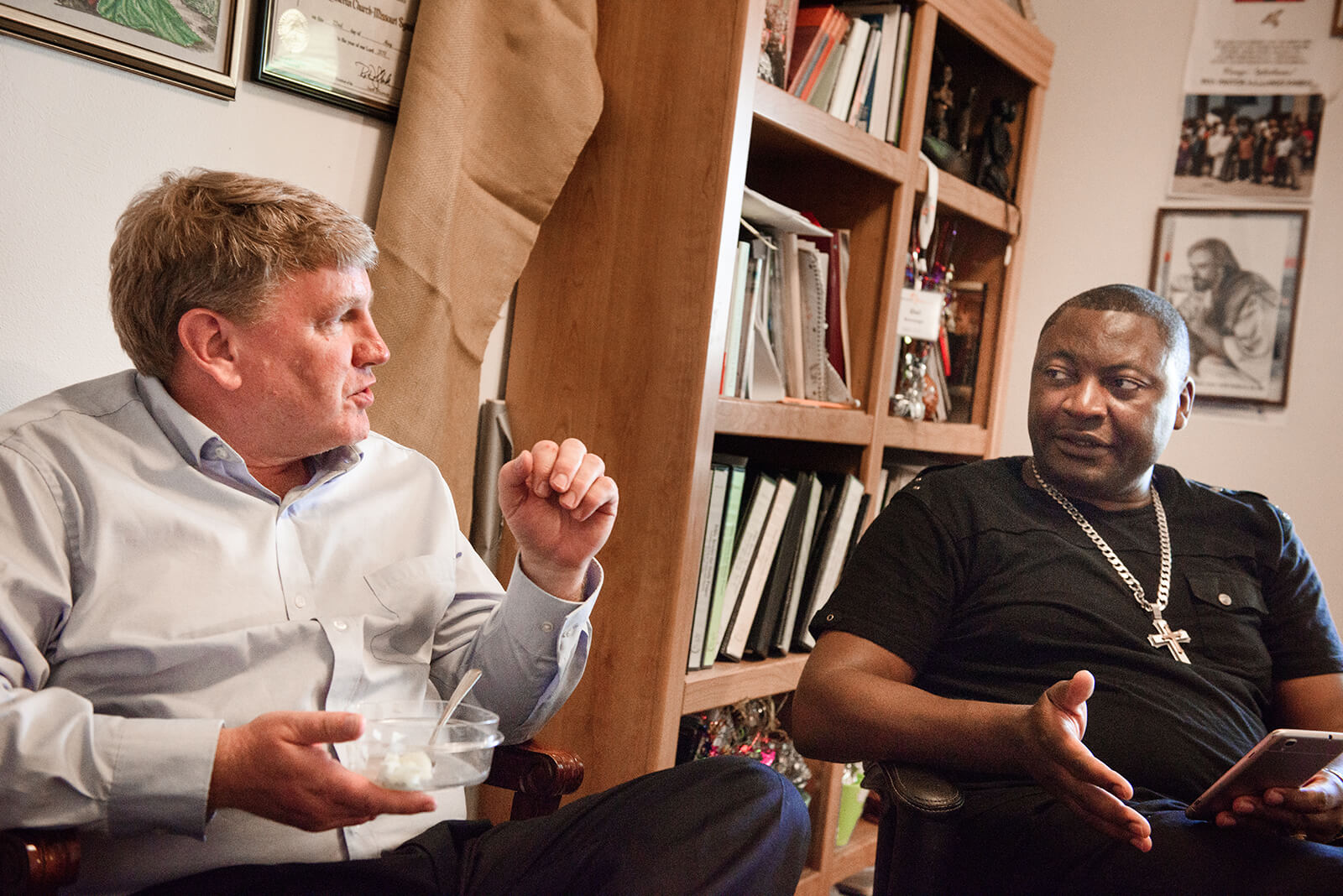 The Rev. Don Hougard (left), pastor of Benediction Lutheran Church, Milwaukee, talks with the Rev. Gui Kasongo Kabeo at his office in August.