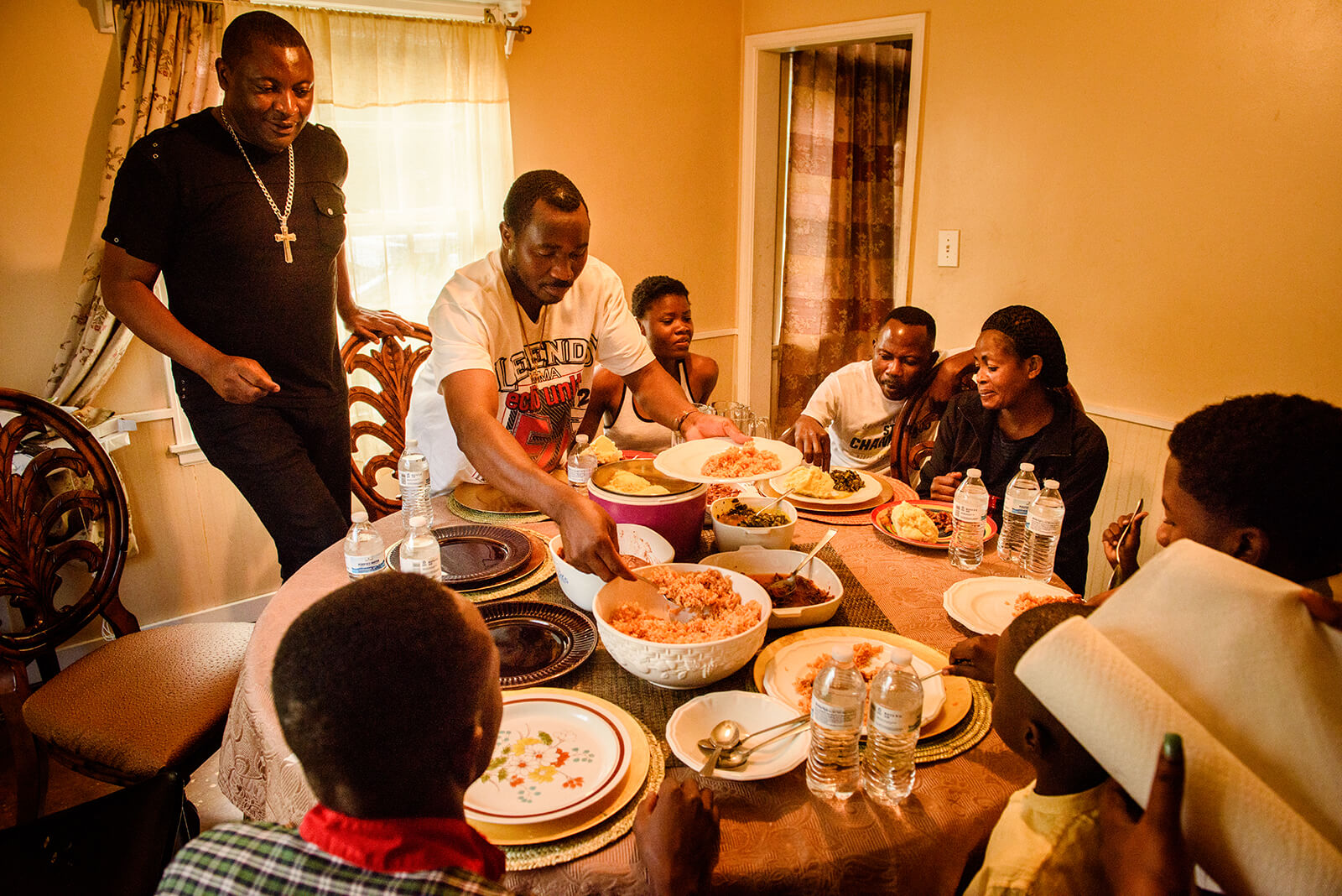 The Rev. Gui Kasongo Kabeo (standing at left), pastor at Eglise Lutherienne Internationale de Sion (International Lutheran Church of Zion) and Gospel Lutheran Church, both in Milwaukee, sits down to his dinner table. Kabeo houses refugees, some seen in this photograph, who do not have a place to go when they arrive in the United States.