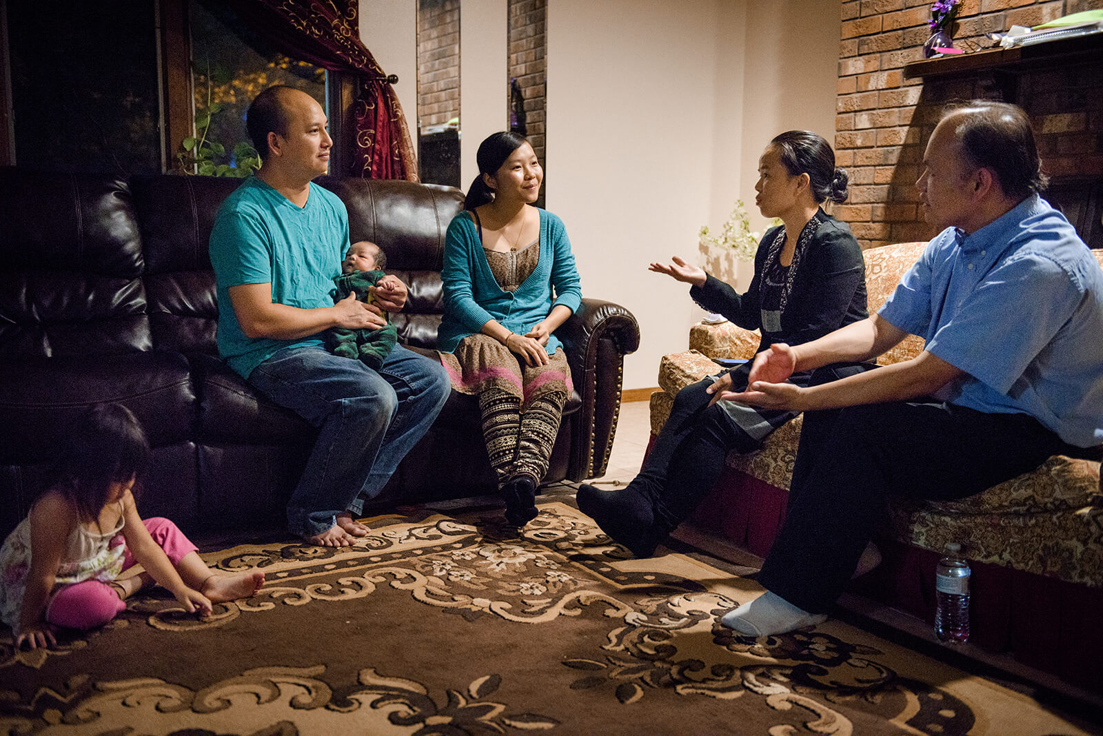The Rev. Moua Vang (right), associate pastor at Benediction Lutheran Church, Milwaukee, and his wife, Kou, visit the home of Soua Chang (left) and his wife, Chuchee Leeyer.
