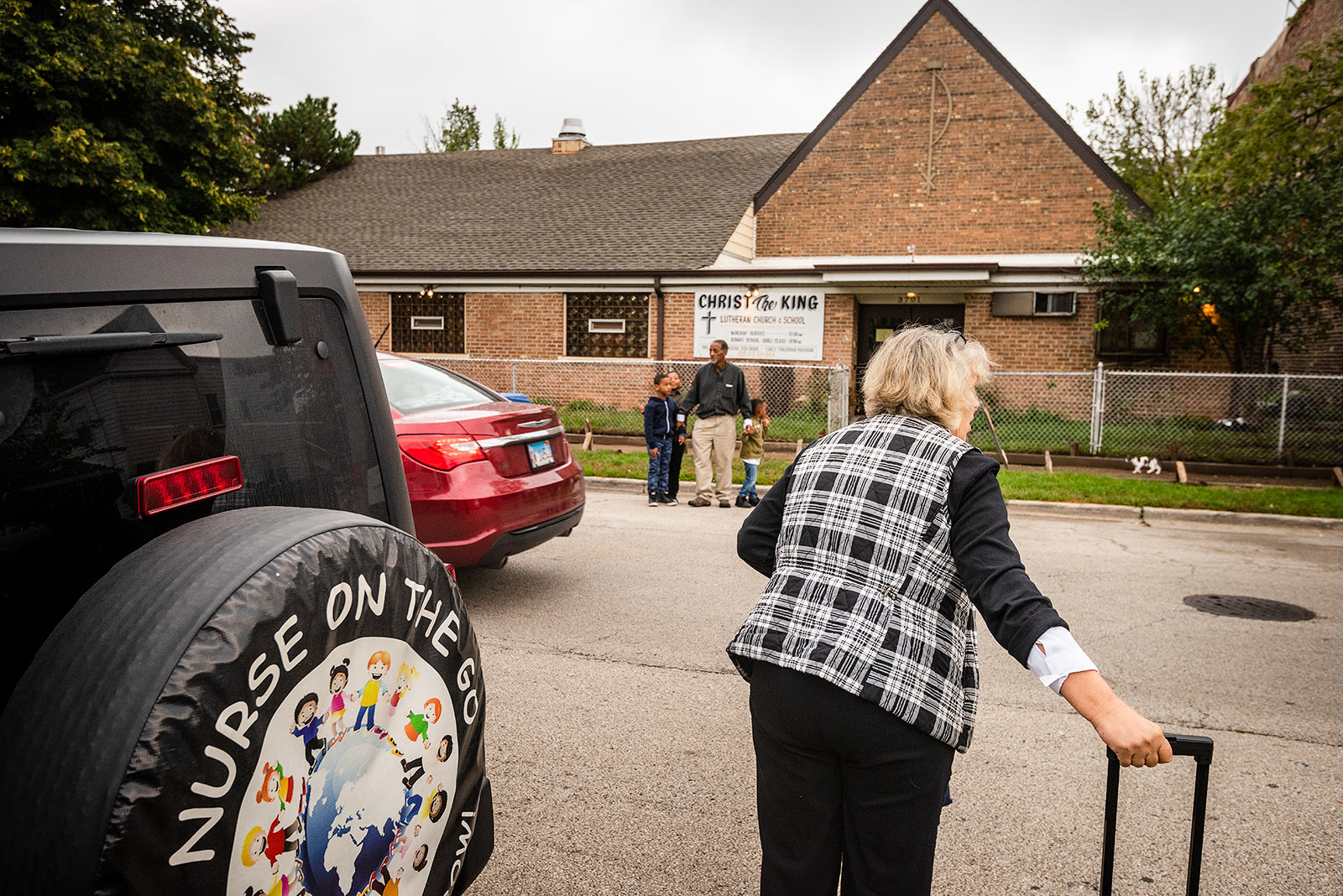 Dr. Patricia Braun, school nurse coordinator for the Chicagoland Lutheran Educational Foundation, navigates Chicago traffic on an October morning.