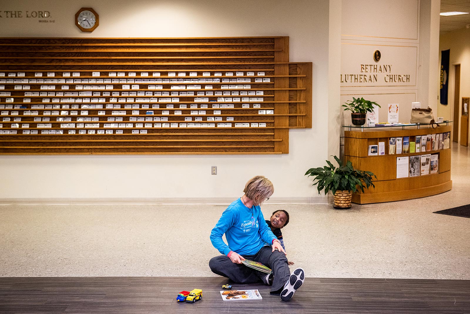 Anderson plays with a young boy from a family living temporarily at Bethany last October. The family, placed by Family Promise of Linn County, was being cared for by a different host congregation each week.