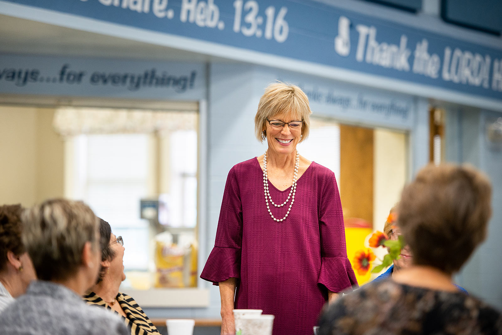 Ronda Anderson, parish nurse at Bethany Lutheran Church, Cedar Rapids, Iowa, greets church members in the fellowship hall.