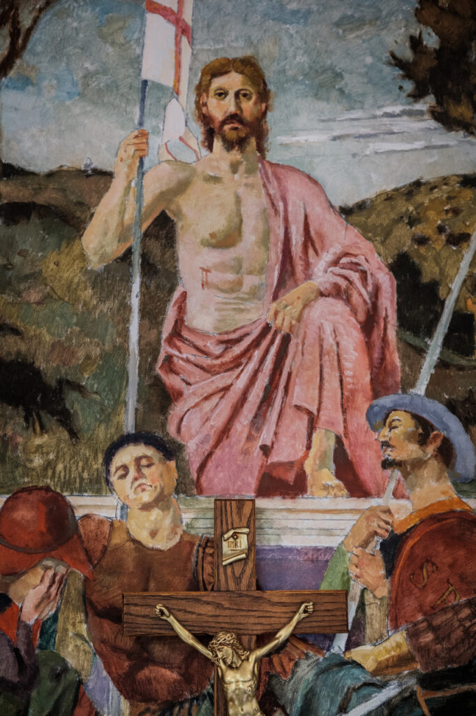 A watercolor painting in the style of Italian painter Piero della Francesca on the chapel altar at First Trinity.