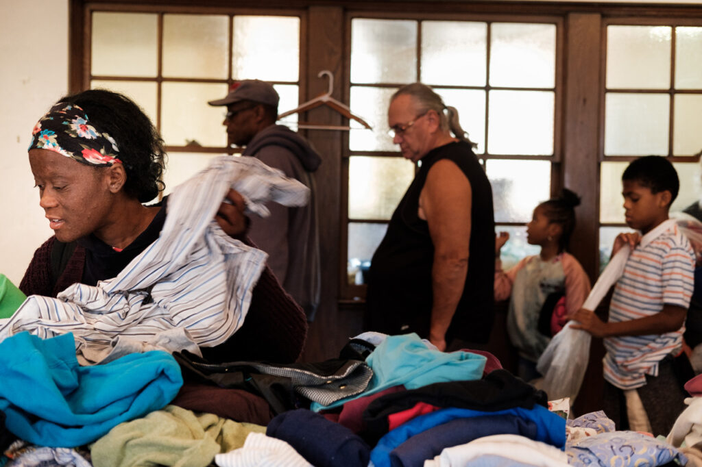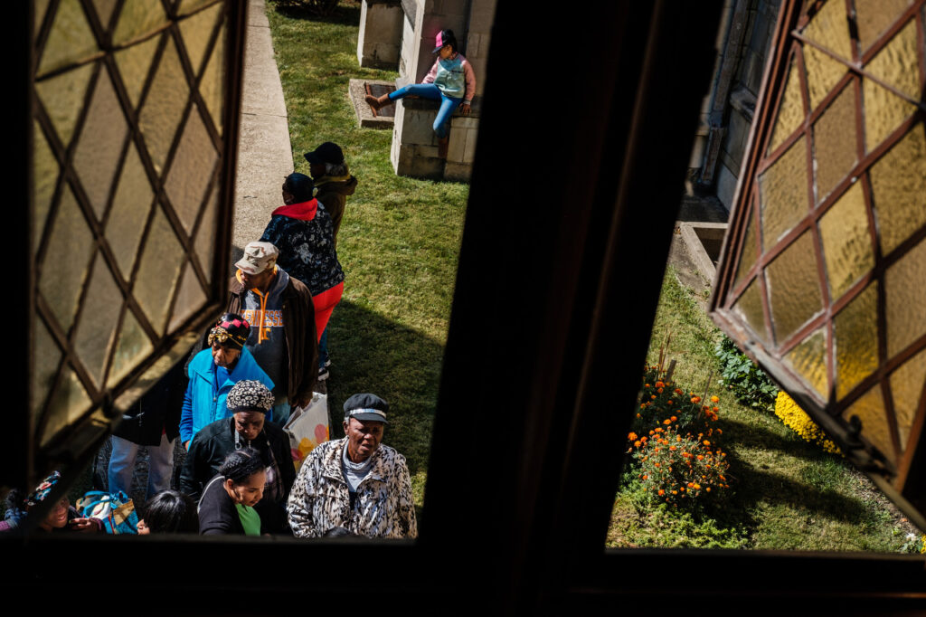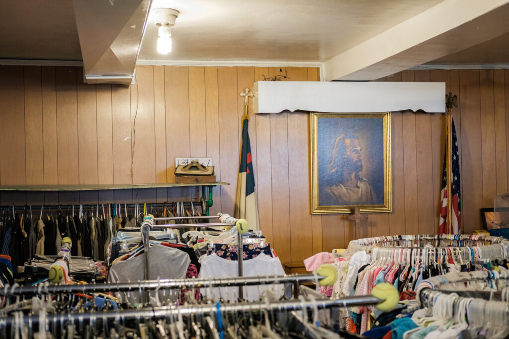 On the second floor of the parish hall, people line up to receive clothing and toiletries from volunteers. The people are audibly grateful for the Word of God and the prayers Spittel offers before they enter.