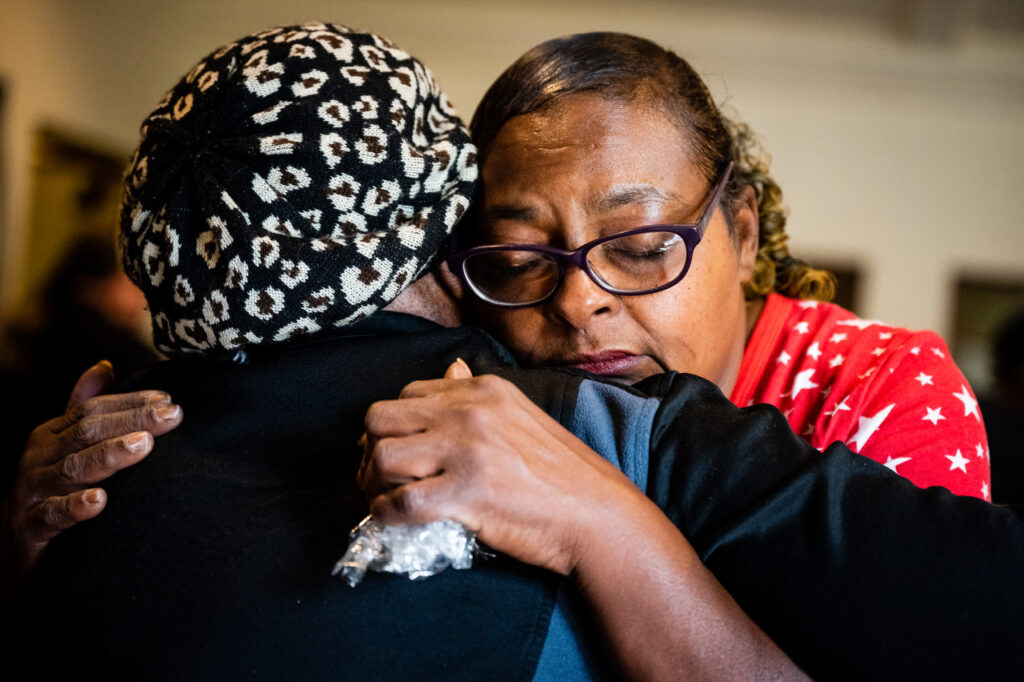 Volunteer Lisa Davis hugs a recipient of First Trinity’s mercy distribution for the homeless.