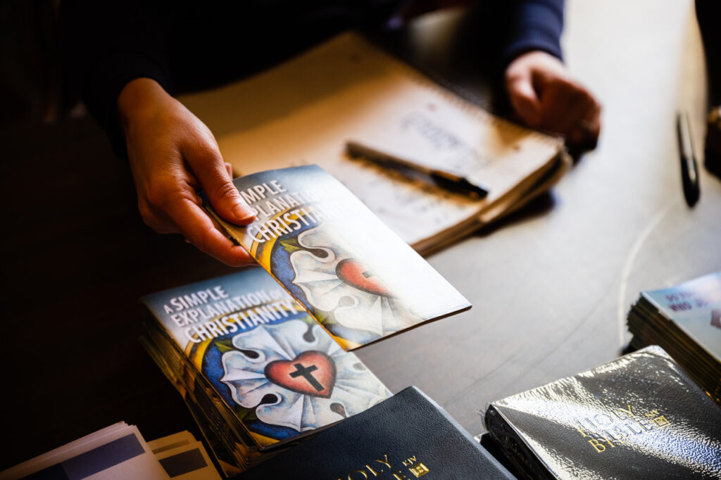 Deaconess Candidate Hanna Kern hands out Lutheran resources.