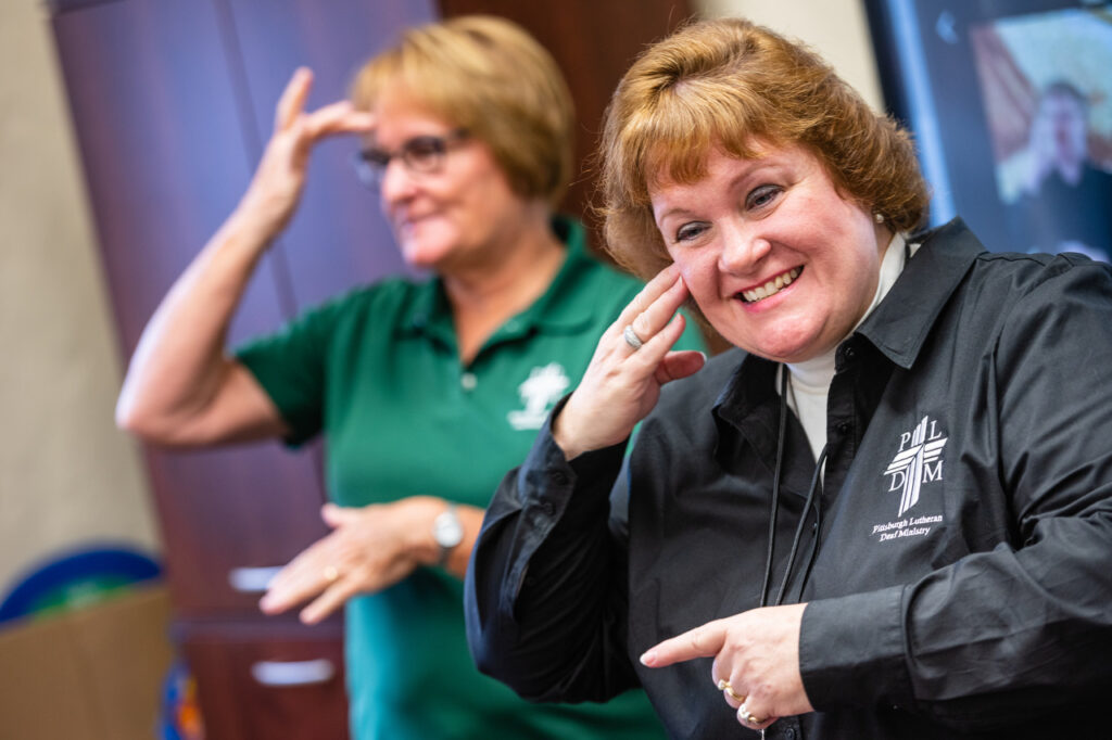 Debra Terhune (right), director of Pittsburgh Lutheran Deaf Ministry, signs during Bible class.