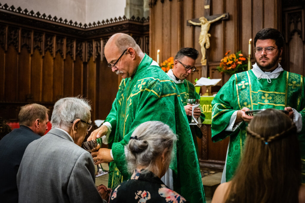 The Rev. Dr. Douglas Spittel, senior pastor of First Trinity, distributes the Sacrament during the Divine Service in October. He is joined by Vicar Timothy Kern (right) and Associate Pastor Eric Andrae (middle).