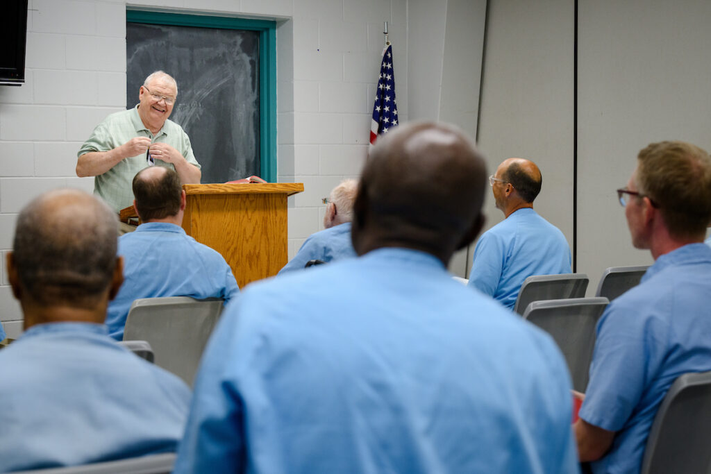 On a Thursday evening in September, Blomquist arrived for his weekly Bible study and greeted the prison staff. They chatted for a while, catching up on local teams and talking about their families. A short time later, Blomquist was led through a large courtyard to a room in the prison. Inside, incarcerated men dressed in blue arrived for the study, stopping to grab hymnals on the way to find a chair.