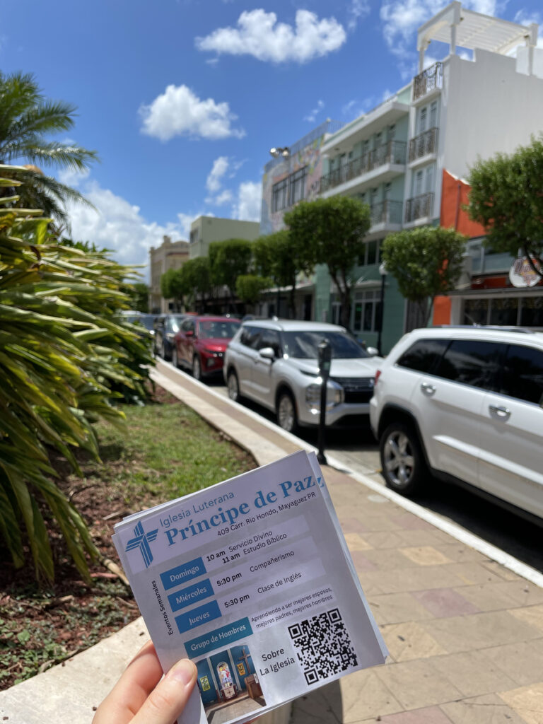 On Thursday morning, we met the Mayagüez-based missionary team in Plaza Cristóbal Colón. Small groups from our team walked around greeting locals and inviting them to the church’s events, including the Divine Service on Sundays, a Bible study on Wednesdays and an English class on Thursdays. I had the joy of walking with LCMS missionary Ruth Maita and her three children. Our team was pleasantly surprised by how welcoming and receptive the Puerto Ricans were to receiving flyers, as everyone we met returned our greetings and accepted the information.
