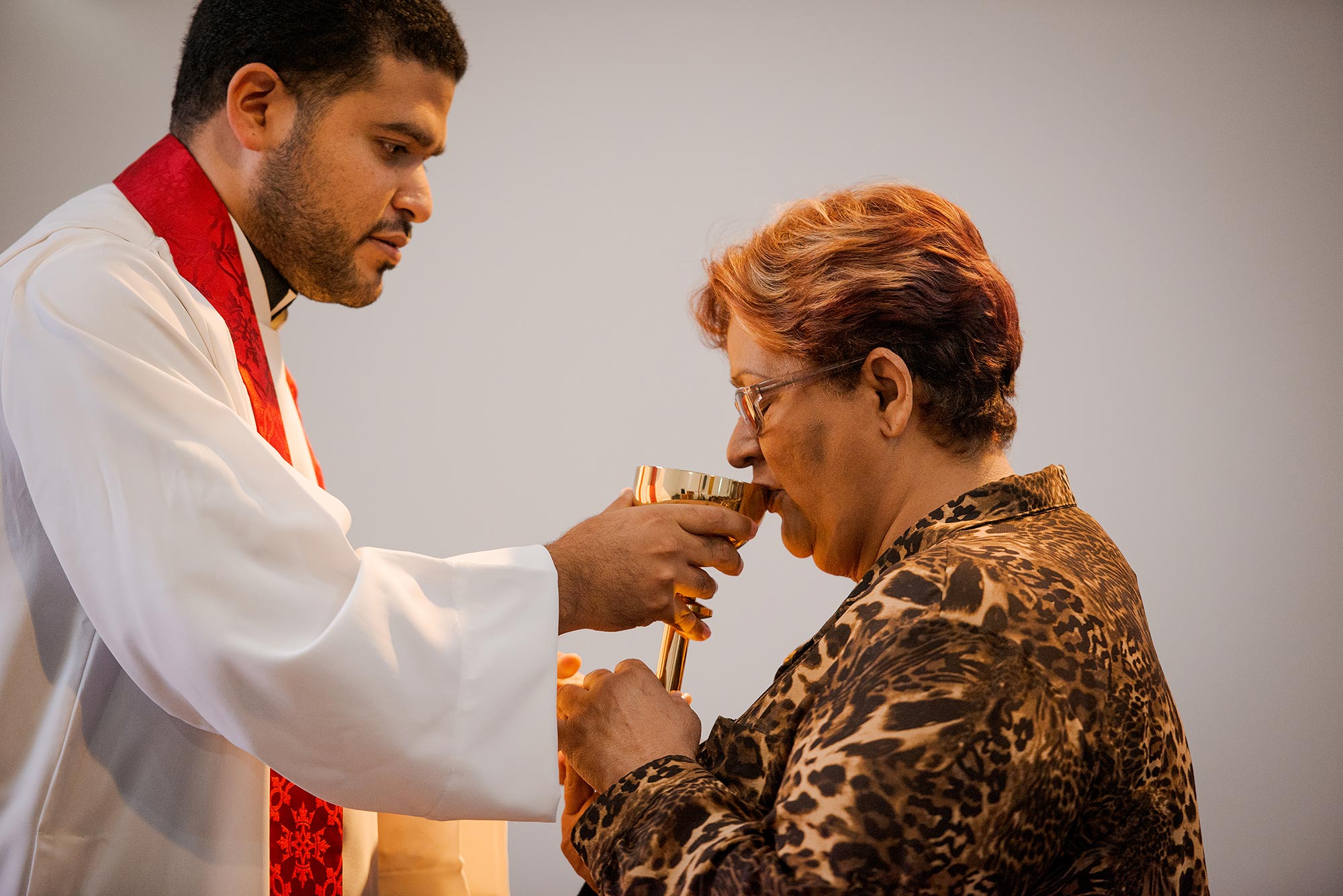 Sylvia Gonzalez receives the Lord’s Supper for the first time as a communicant member of Principe de Paz.