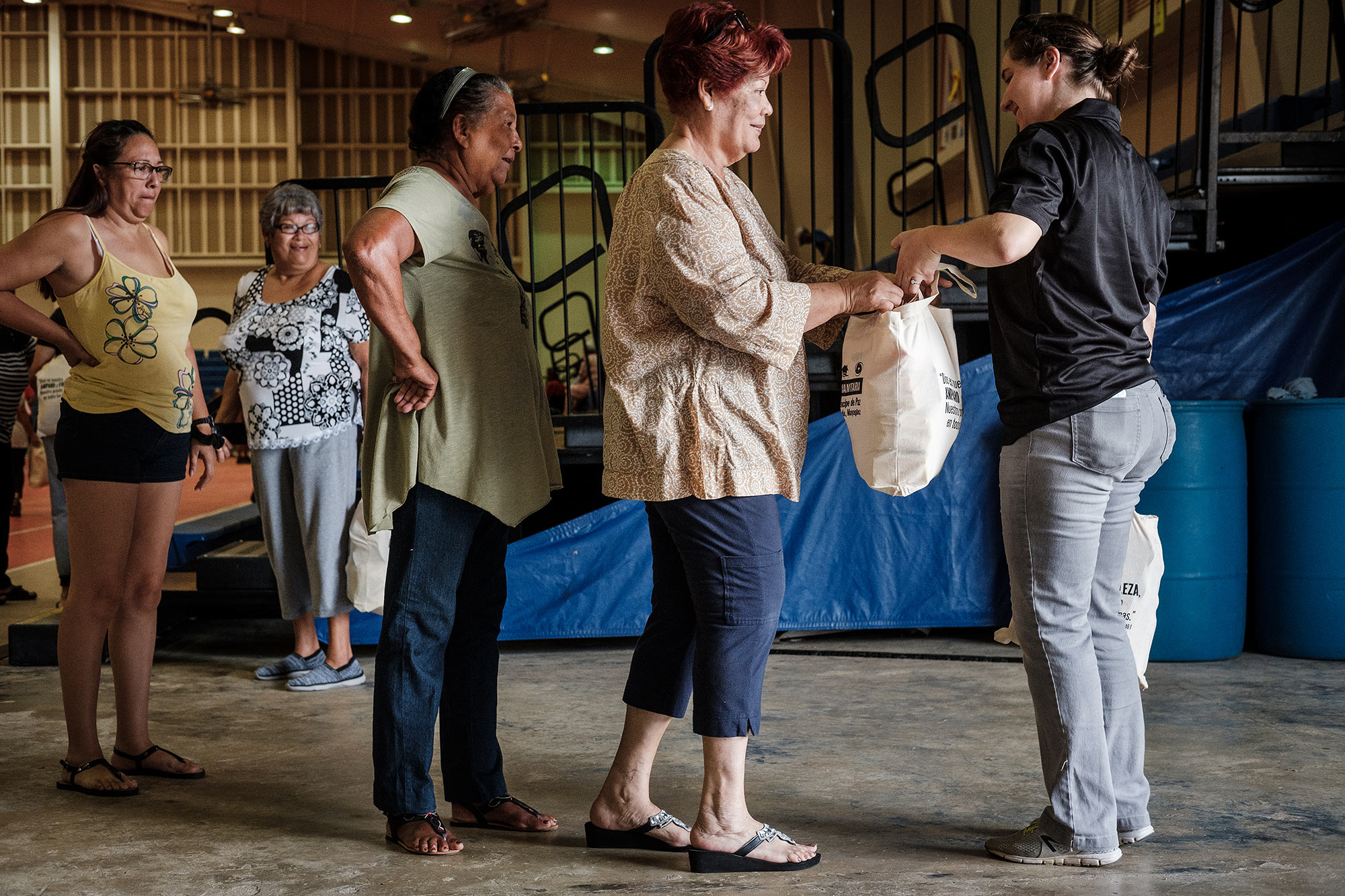 Residents receive bags of food and supplies during a weekly distribution in Mayaguez.