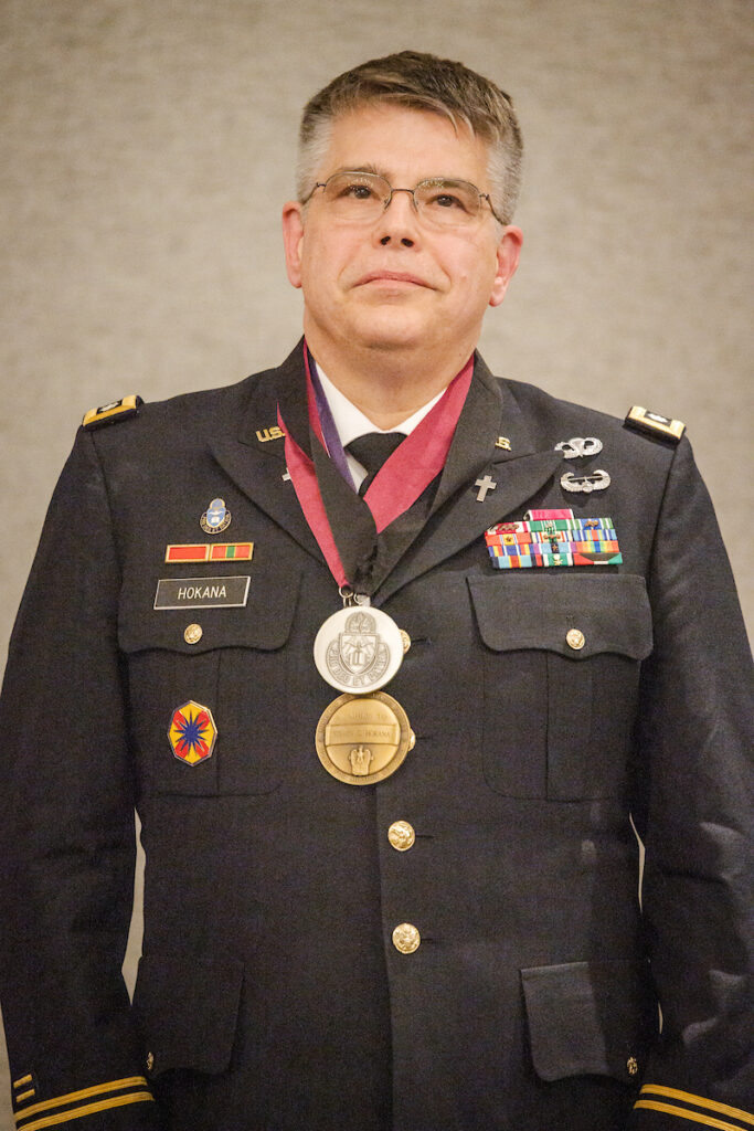 Chaplain (Lt. Col.) Steven Hokana, assistant director of LCMS Ministry to the Armed Forces (MAF), receives an award at the MAF dinner during the 2019 Synod convention.