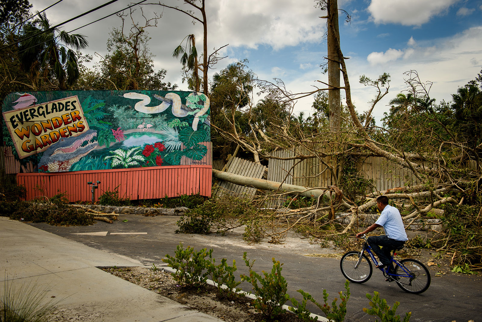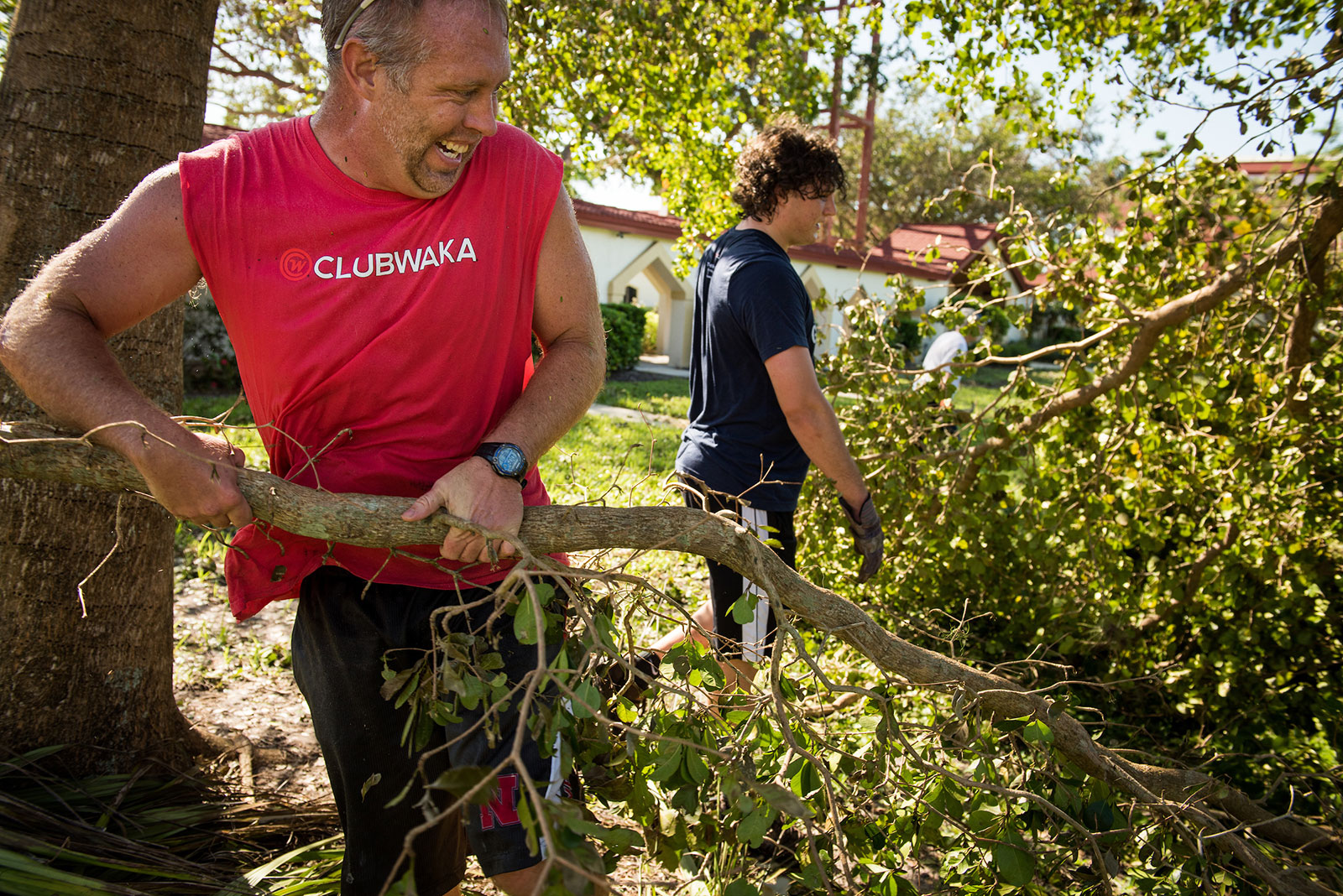 Top: Tim Richter, director of Christian education at Zion Lutheran Church, Fort Myers, Fla., and Jack Proctor, director of Christian education at Saint Michael Lutheran Church, Fort Myers, remove fallen tree branches leftover from Hurricane Irma in September. Bottom: Damage in Bonita Springs, Fla.