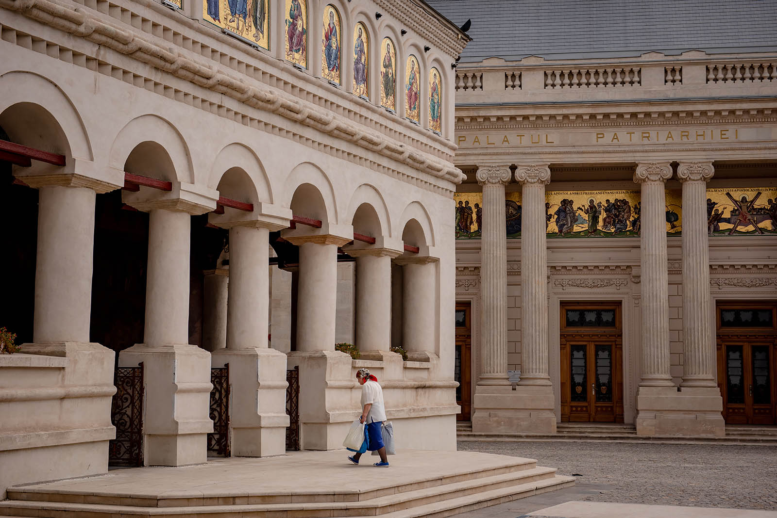 A woman walks into the Romanian Orthodox Patriarchal Cathedral in Bucharest.