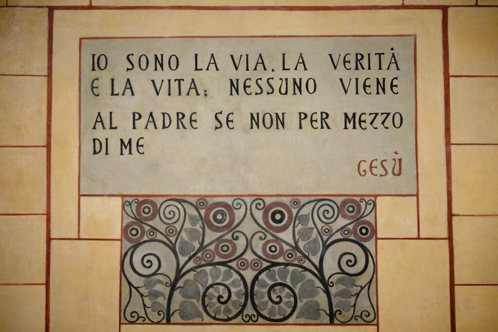 The building belongs to a Baptist congregation in Rome and bears the Italian translation of the Lord’s Prayer inscribed along beautifully ornamented walls. The pulpit perches above the altar, with the words Predichiamo Cristo crocifisso (“We preach Christ crucified”) in gold lettering across the front. The altar bears the words Fate questo in memoria di me (“Do this in remembrance of me”).