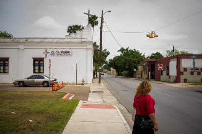 Top, from left: El Calvario Lutheran Church in Brownsville, Texas. The border between Mexico and the United States. Bottom, from left: Students head to class at the University of Texas Rio Grande Valley in Brownsville. Downtown Brownsville, soon to be revitalized through the Texas Historical Commission’s “Main Street City” program.