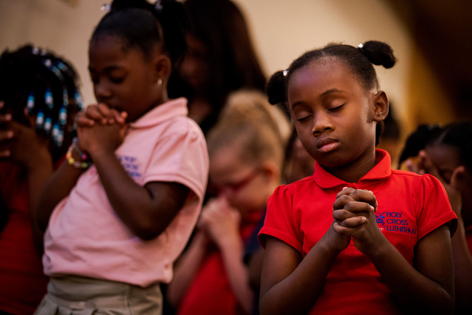 The Rev. Dennis Bartels, pastor of Holy Cross Lutheran Church, leads chapel at the school. Below, students pray during the service.