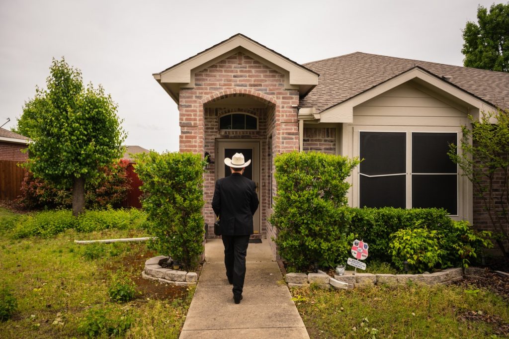 Top row: The Rev. Kurt Ulmer, pastor of Faith Lutheran Church in Wylie, Texas, visits a shut-in. Middle row: The Rev. James Woelmer, senior pastor of Faith Lutheran Church in Plano, Texas, leads chapel. Bottom photo: Downtown Wylie, Texas.