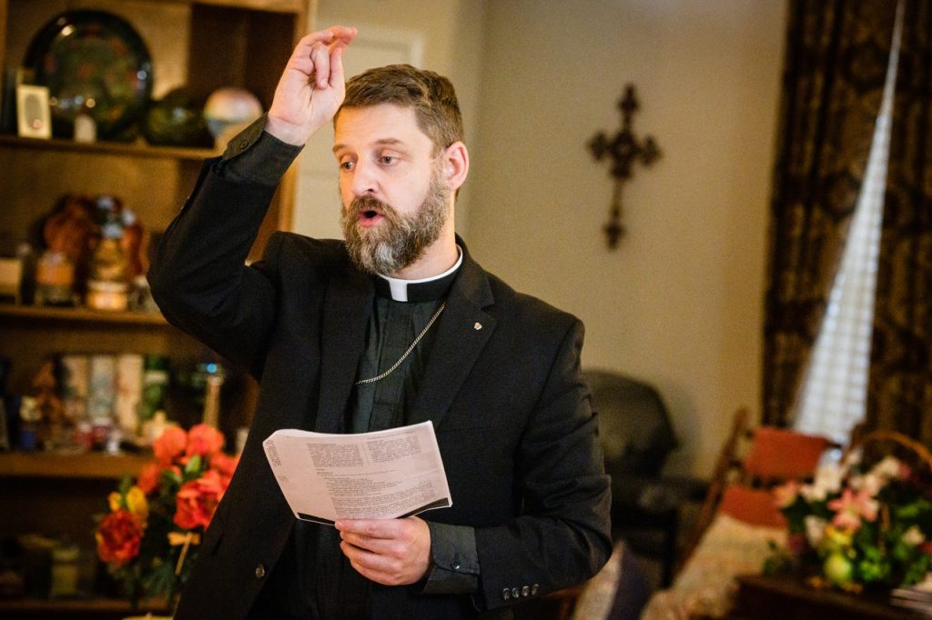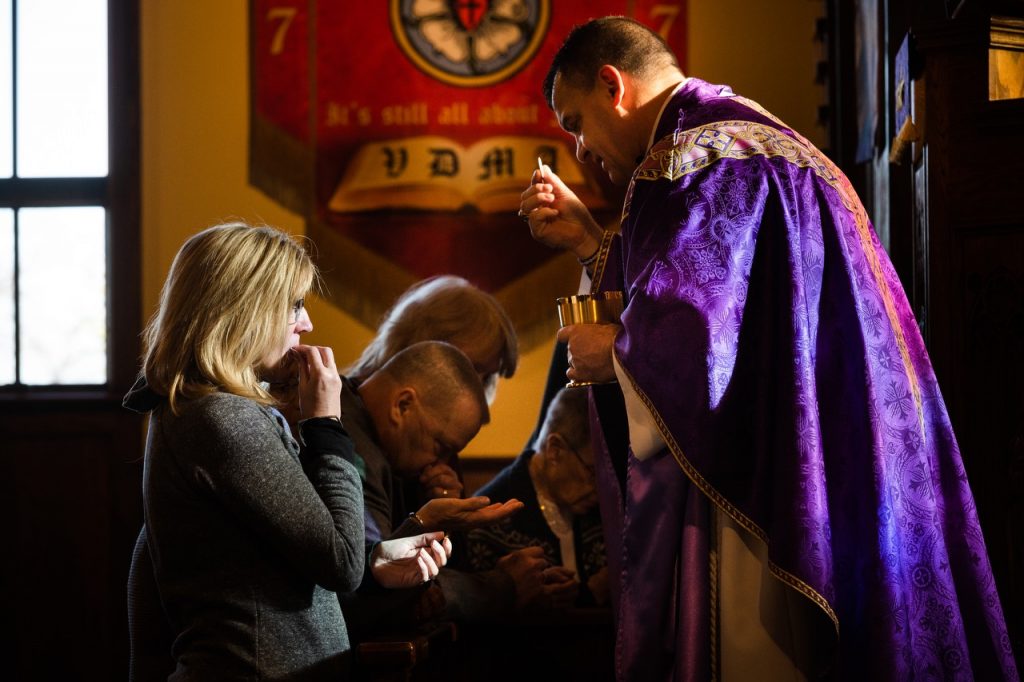 The Rev. Robert Weinkauf distributes the Sacrament at Risen Savior Lutheran Church, Basehor, Kan., in March.