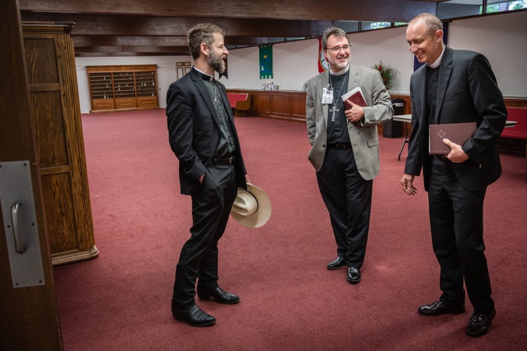 Top: Faith Lutheran Church in Wylie. Bottom: The Rev. Kurt Ulmer, pastor of Faith, Wylie, chats with the Rev. Stephen Kieser, headmaster of Faith Lutheran School, Plano, and the Rev. James Woelmer, senior pastor of Faith Lutheran Church, Plano, after morning prayer with students.