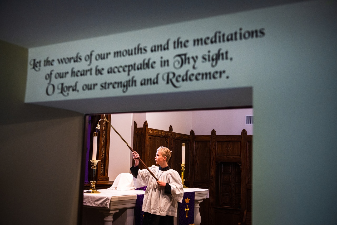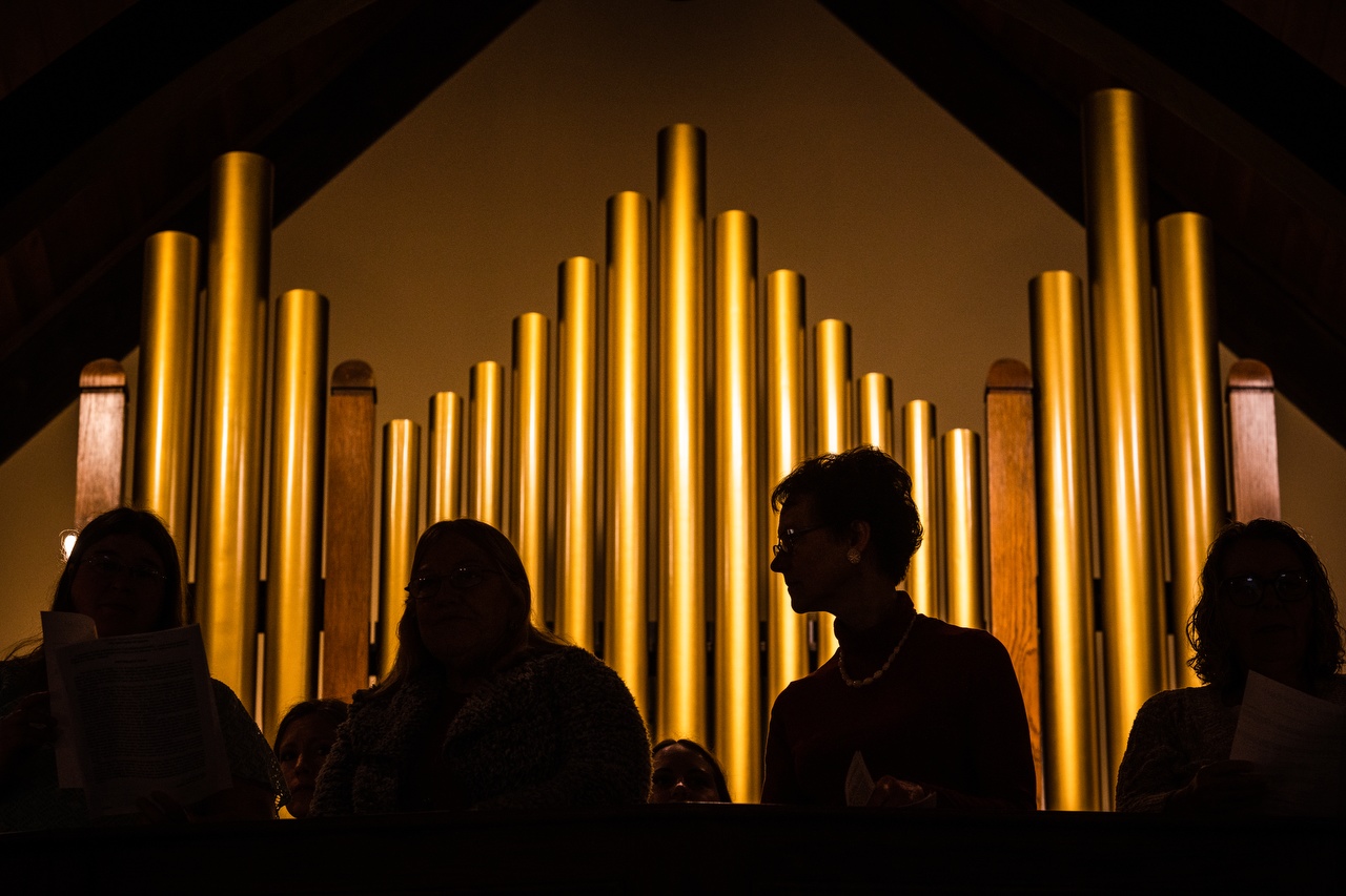 A foundation stone from each church is propped up in the sanctuary doorway. Two banners, one from each parish, hang on the wall framing two steep stained-glass windows, depicting Christ’s crucifixion and resurrection as our risen Savior. As the children’s choir rehearsed in the sanctuary before the second service, the past and the future testify to the hope all share in Christ.