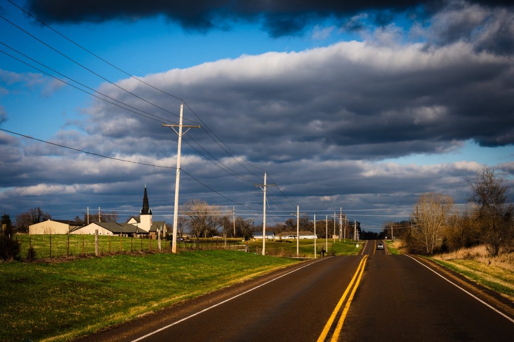 The parishioners worked to bring the two congregations together. Conflict was resolved through prayer and discussion. A new building was erected — the steeple seen as you drive up the hilly road. When the sun descends in the West, the light casts a long shadow from the crucifix above the entrance.